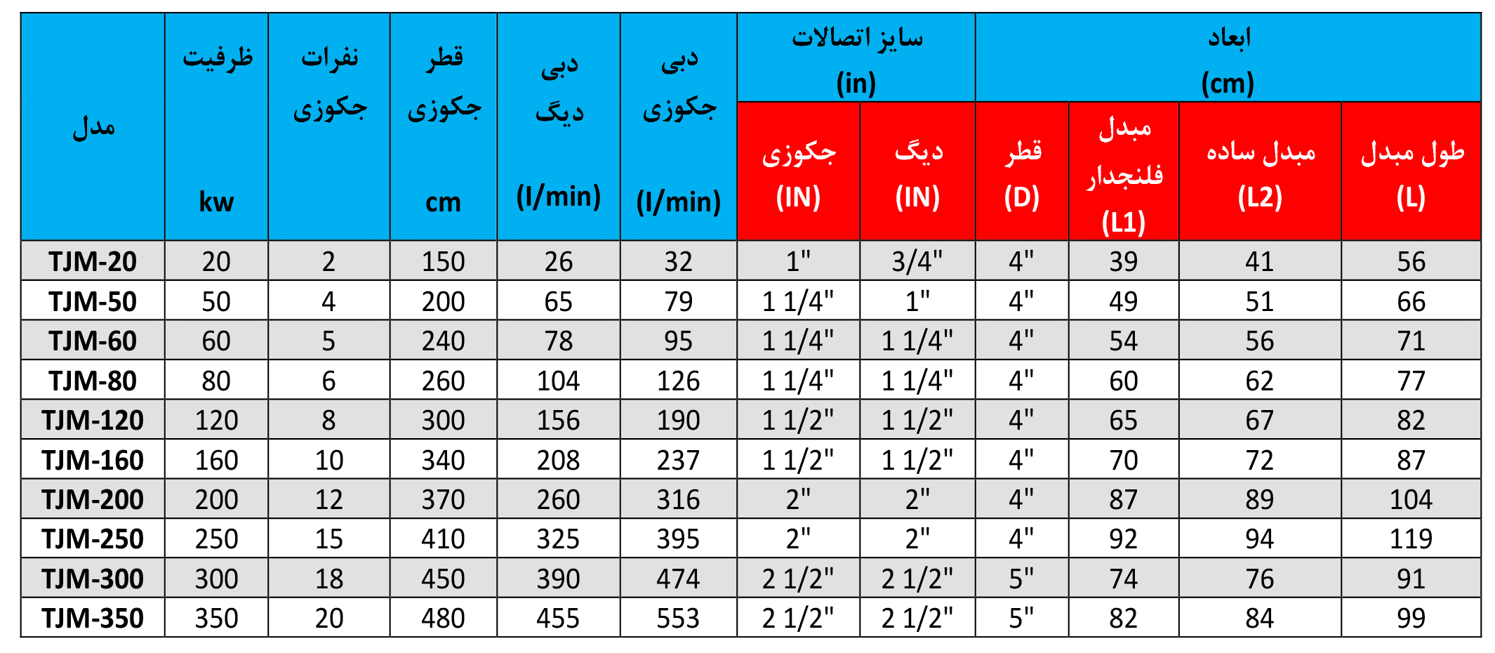 - مبدلهاي جكوزي مدل TJM در دو مدل فلنج دار و بدون فلنج (ساده ) توليد مي شوند. مبدلهاي ساده داراي وزن و قيمت پايين تر بوده و توسط تزريق اسيد به داخل آنها شستشو مي شوند. اما در مبدلهاي فلنج دار ، قابليت باز شدن سرهاي مبدل وجود دارد كه اين امر به شستشوي راحت تر ، سيخ زني داخل تيوبها و حتي تعويض تيوبهاي كمك مي نمايد.